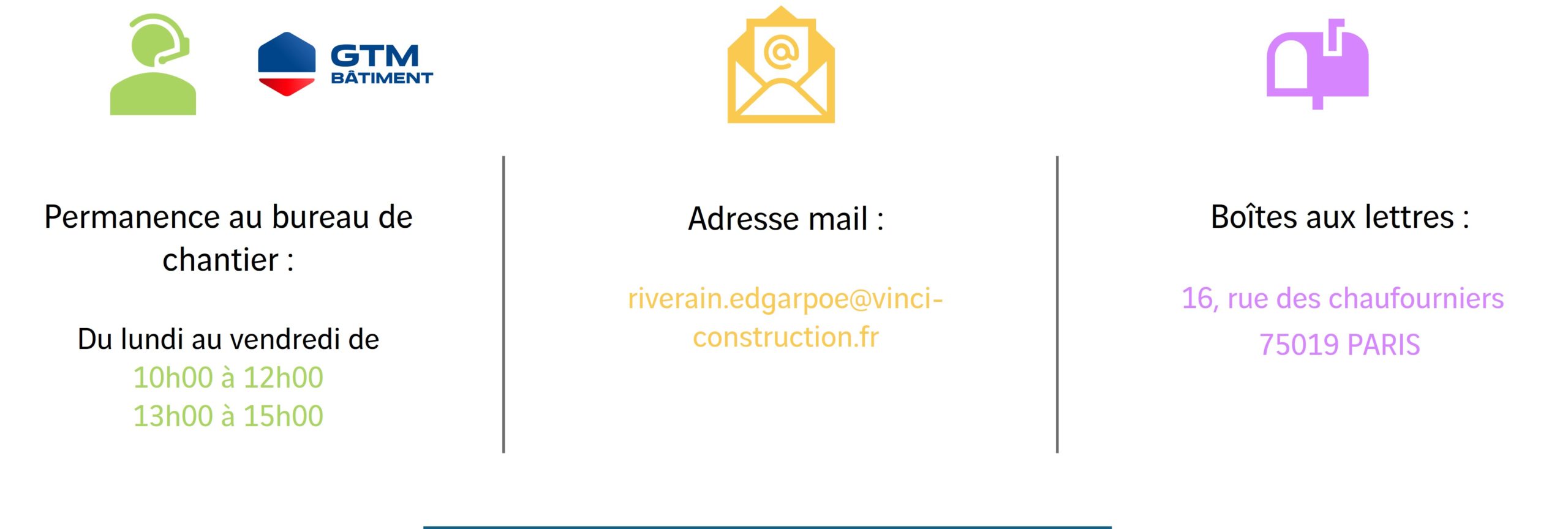 Concernant les travaux (dates des interventions, signalements, …) vous avez la possibilité de vous adresser au bureau de chantier en vous déplaçant ou adressant un mail.