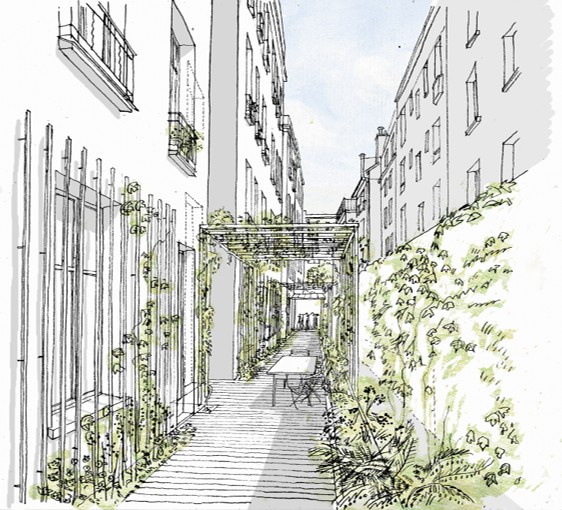 La venelle sud va être transformée en cour-jardin avec des pergolas, des plantes grimpantes et un sol boisé. Ce sera un espace partagé entre les deux immeubles, accessible à tous les habitants.