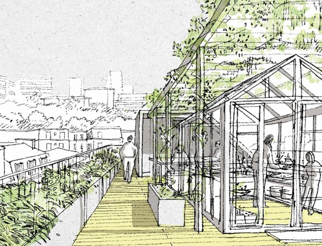 La toiture va accueillir un jardin suspendu de 270 m² offrant un prolongement extérieur en hauteur. On y retrouvera un potager partagé, une serre et des infrastructures en bois.