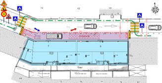 L’installation de chantier a été réalisée au 5-7 rue Edgar Poe 75019 Paris. Un débord sur la chaussée a été aménagé afin de créer une zone de livraison et de stockage. L’organisation comprend également une signalisation pour les piétons et véhicules afin de pouvoir circuler autour du chantier.